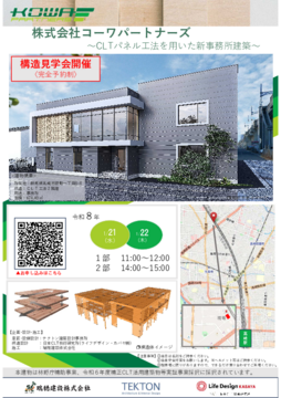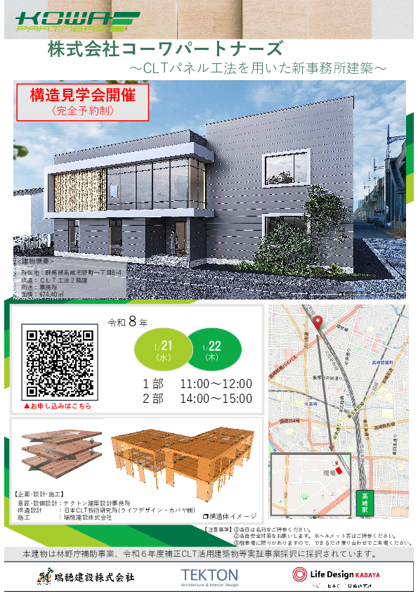CLTパネル工法による2階建て事務所の構造見学会を高崎市内において来年1月21日、22日に開催いたします